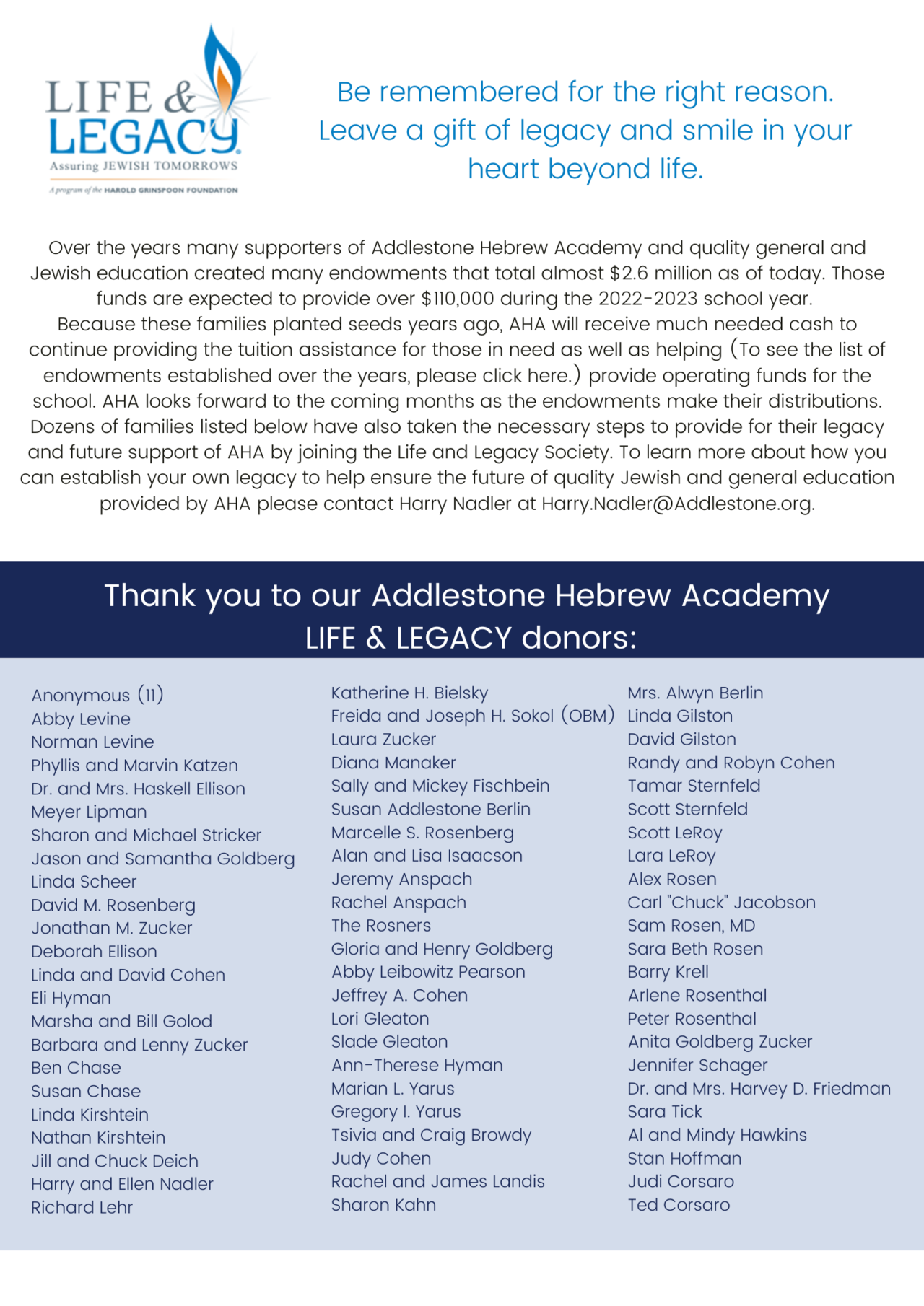 To learn more about how you can establish your own legacy to help ensure the future of quality Jewish and general education provided by AHA please contact Abby Ravski at abby.ravski@addlestone.org.
