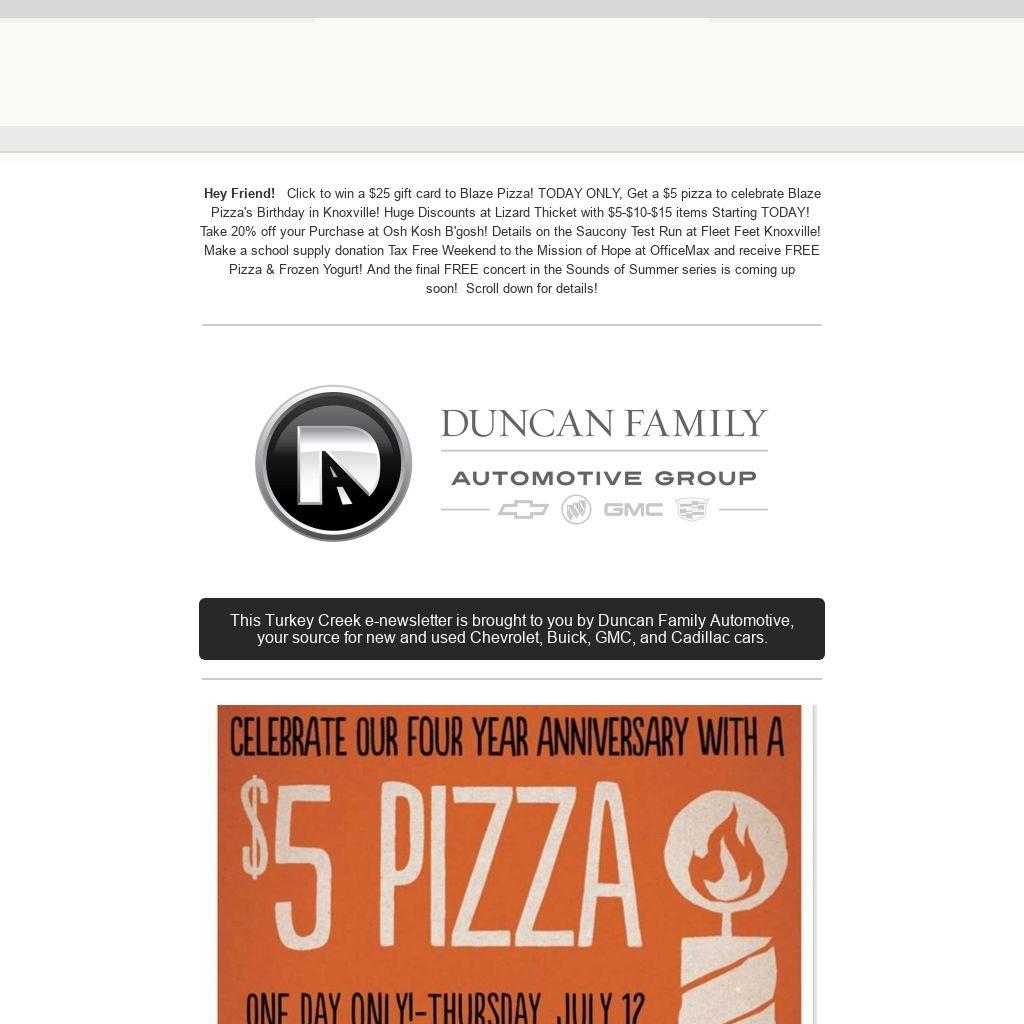 Hey Friend! Click to win a $25 gift card to Blaze Pizza! TODAY ONLY, Get a $5 pizza to celebrate Blaze Pizza's Birthday in Knoxville! Huge Discounts at Lizard Thicket with $5-$10-$15 items Starting TODAY! Take 20% off your Purchase at Osh Kosh B'gosh! Details on the Saucony Test Run at Fleet Feet Knoxville! Make a school supply donation Tax Free Weekend to the Mission of Hope at OfficeMax and receive FREE Pizza & Frozen Yogurt! And the final FREE concert in the Sounds of Summer series is coming up soon! Scroll down for details!