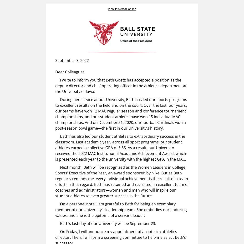 I write to inform you that Beth Goetz has accepted a position as the deputy director and chief operating officer in the athletics department at the University of Iowa.