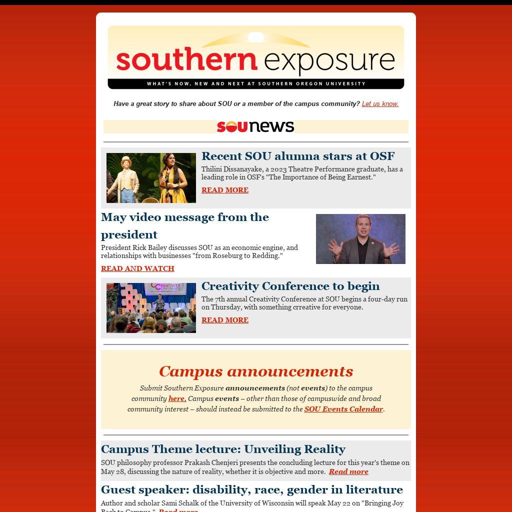Submit Southern Exposure announcements (not events) to the campus community here. Campus events – other than those of campuswide and broad community interest – should instead be submitted to the SOU Events Calendar.