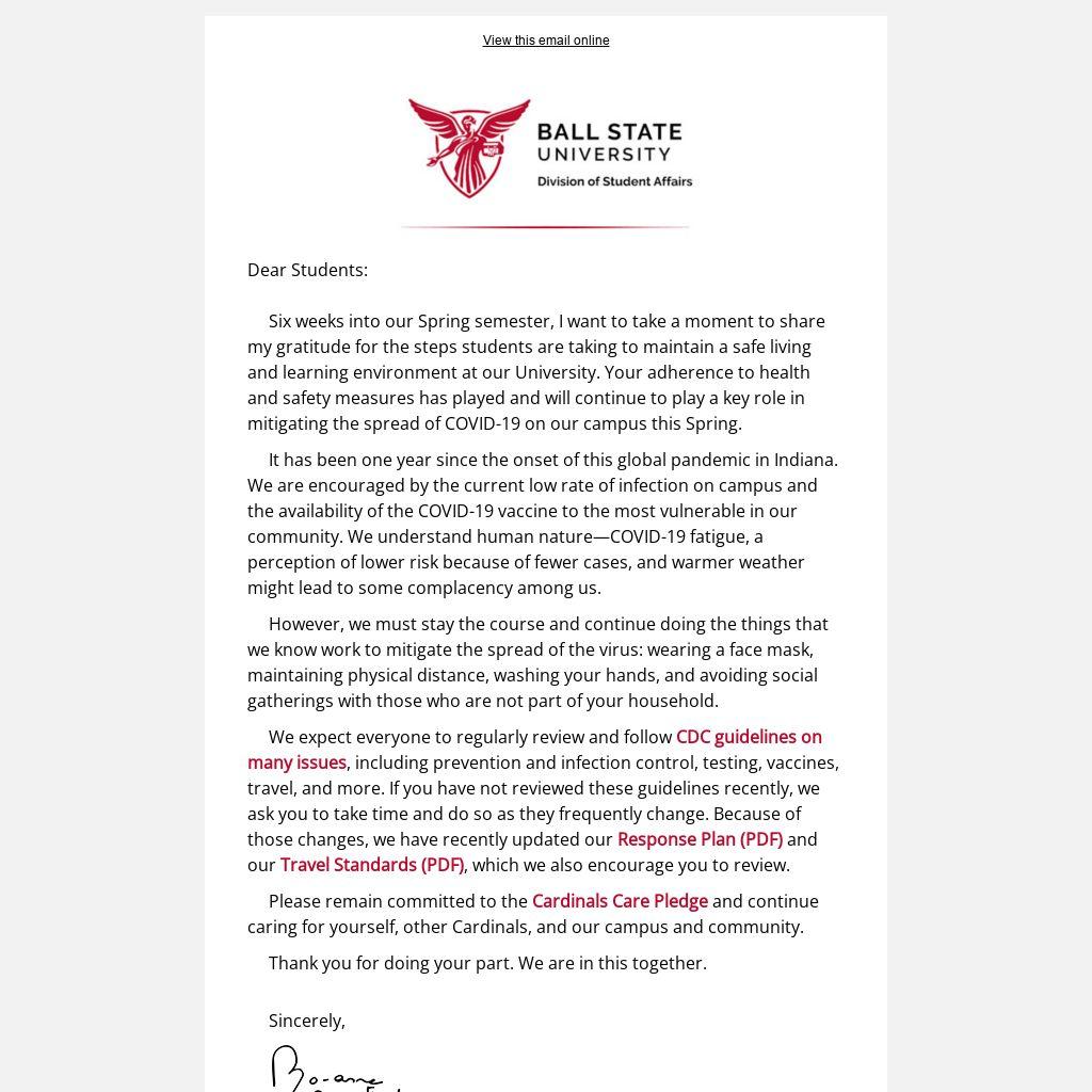 Six weeks into our Spring semester, I want to take a moment to share my gratitude for the steps students are taking to maintain a safe living and learning environment at our University. Your adherence to health and safety measures has played and will continue to play a key role in mitigating the spread of COVID-19 on our campus this Spring.