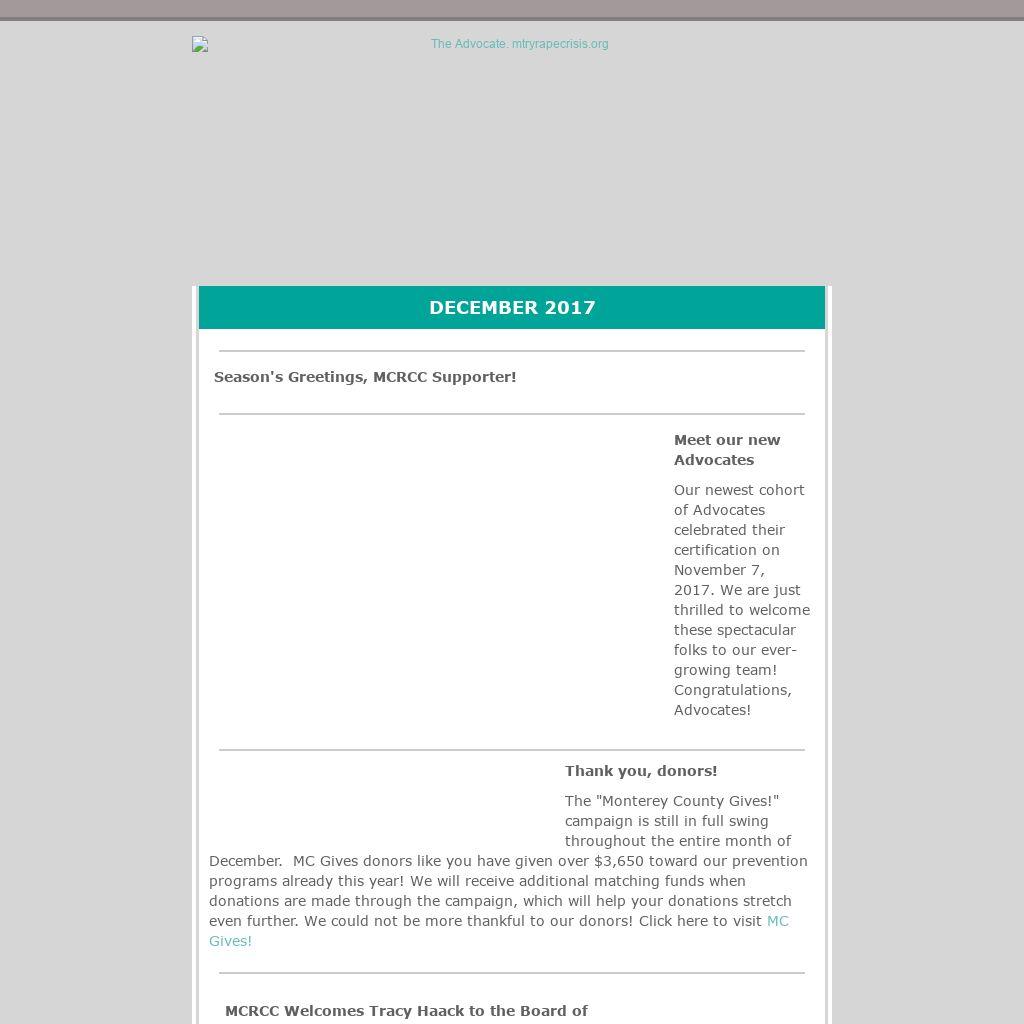 Tracy Haack is our new Board Advocate Representative. A native Californian by birth, Tracy moved back to the state in 1990 to begin her career as an atmospheric scientist with the U.S. Naval Research Laboratory. She has enjoyed living in and being surrounded by the natural beauty of the Monterey Bay area: hiking, biking, camping, and beach combing all along the Central CA coast. Ms. Haack served as an advocate for the MCRCC dating back to the Fall of 2013 and considers her volunteer work with the Center one of the most rewarding experiences. She, her husband, and teenage daughter truly appreciate visiting the country's National Parks and taking road trips in all the western states.