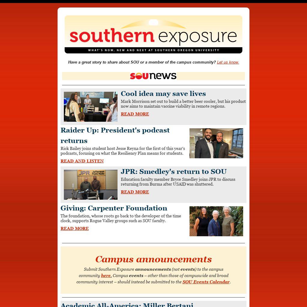 Submit Southern Exposure announcements (not events) to the campus community here. Campus events – other than those of campuswide and broad community interest – should instead be submitted to the SOU Events Calendar.