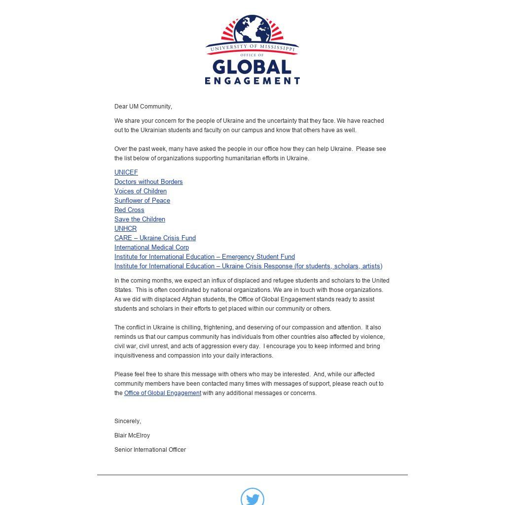 We share your concern for the people of Ukraine and the uncertainty that they face. We have reached out to the Ukrainian students and faculty on our campus and know that others have as well.