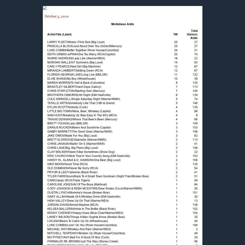 | Artist/Title (Label) | TW | Total Historic Adds |