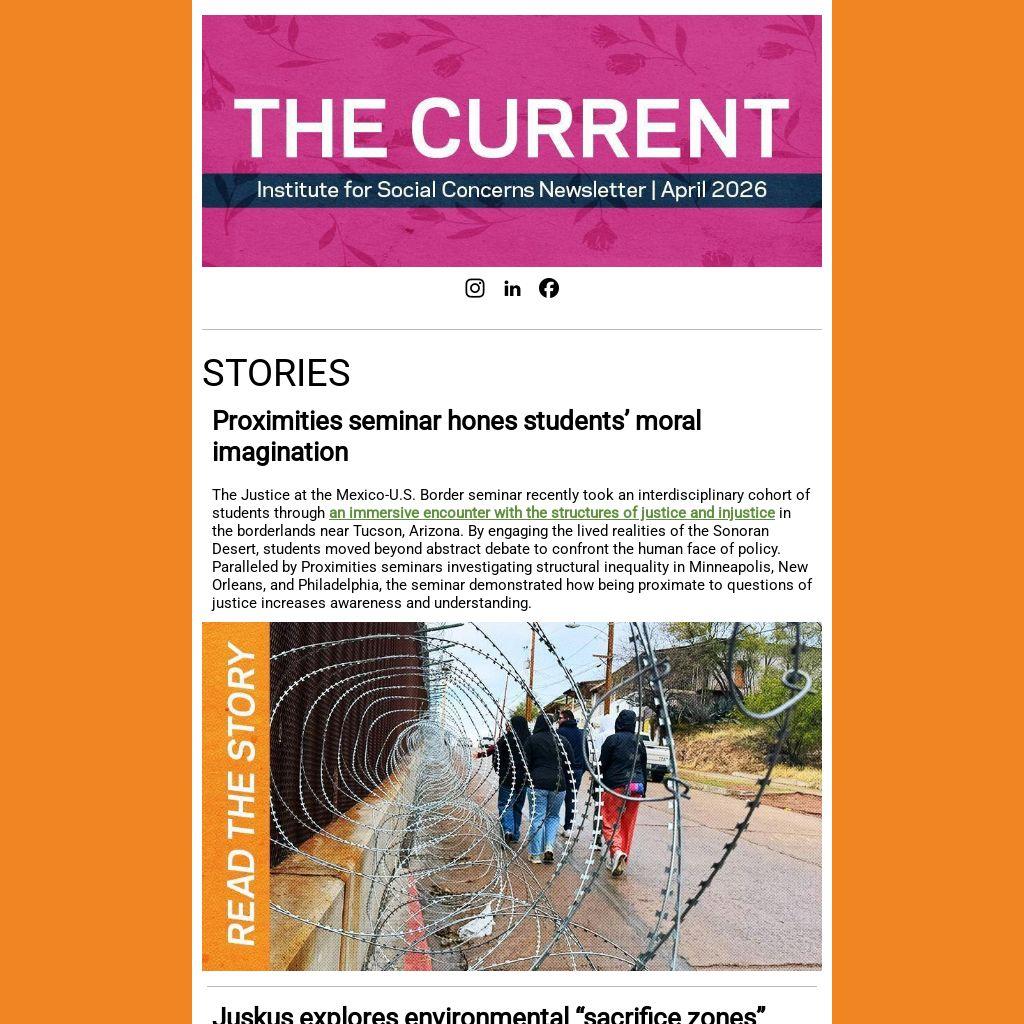 The Justice at the Mexico-U.S. Border seminar recently took an interdisciplinary cohort of students through an immersive encounter with the structures of justice and injustice in the borderlands near Tucson, Arizona. By engaging the lived realities of the Sonoran Desert, students moved beyond abstract debate to confront the human face of policy. Paralleled by Proximities seminars investigating structural inequality in Minneapolis, New Orleans, and Philadelphia, the seminar demonstrated how being proximate to questions of justice increases awareness and understanding.