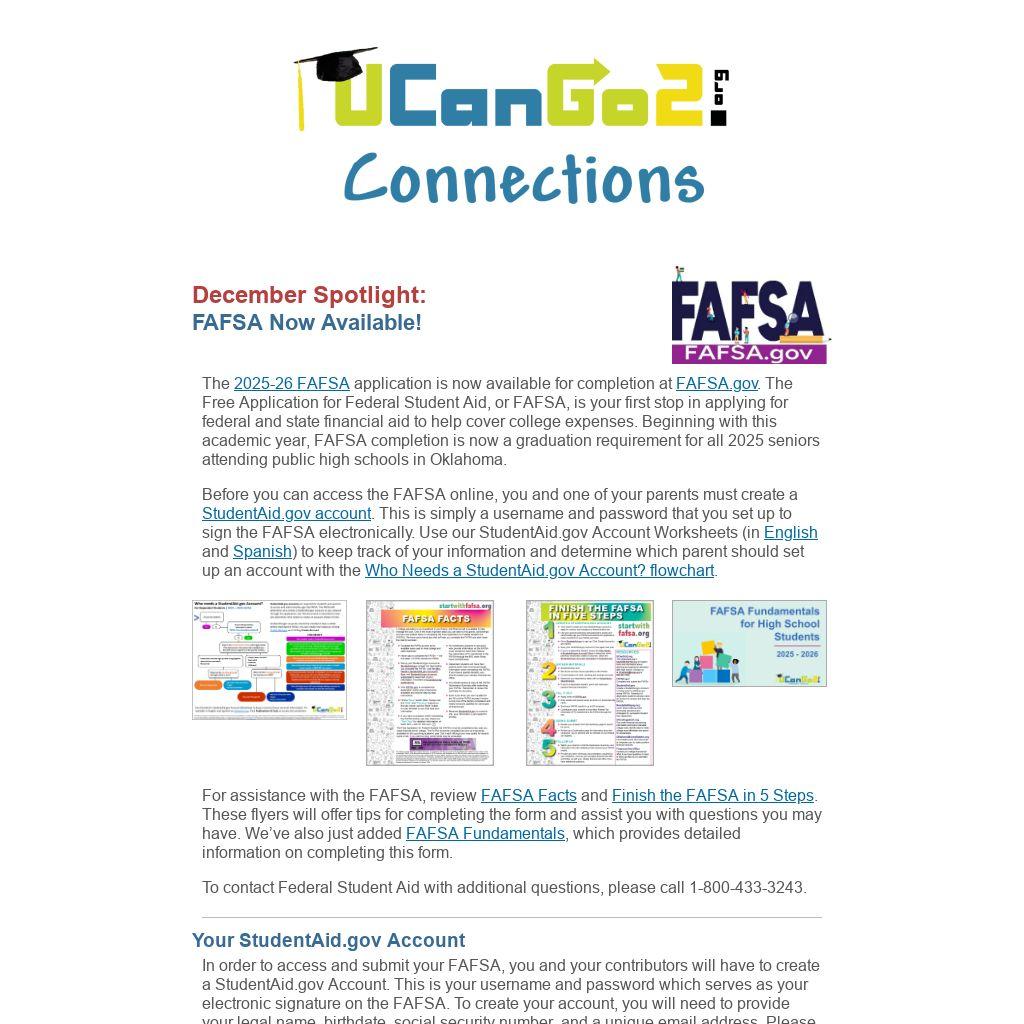 The UCanGo2 Outreach Team is available to provide free presentations or Zoom webinars at your school, library or community center on college planning and the FAFSA! We can also share information about Oklahoma’s Promise, finding scholarships, and creating a StudentAid.gov account. To request a workshop: