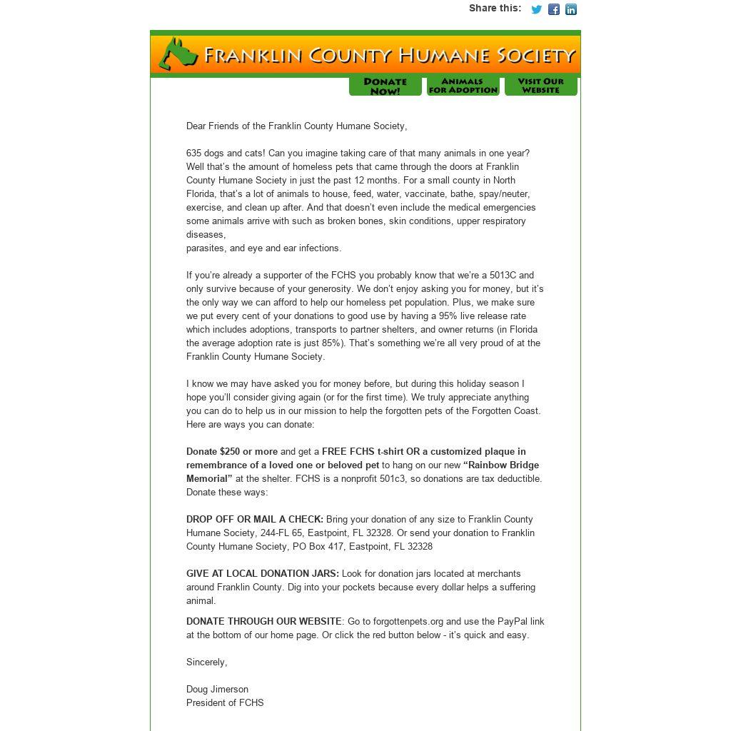 If youâre already a supporter of the FCHS you probably know that weâre a 5013C and only survive because of your generosity. We donât enjoy asking you for money, but itâs the only way we can afford to help our homeless pet population. Plus, we make sure we put every cent of your donations to good use by having a 95% live release rate which includes adoptions, transports to partner shelters, and owner returns (in Florida the average adoption rate is just 85%). Thatâs something weâre all very proud of at the Franklin County Humane Society.