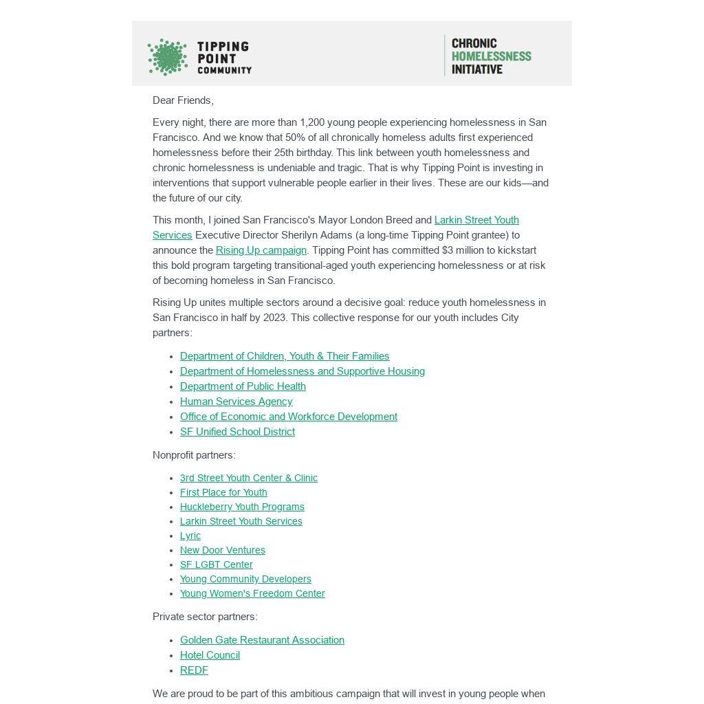 "The Rising Up campaign represents an unprecedented investment in youth experiencing homelessness in San Francisco. It’s an exciting time as so many stakeholders are coming together to rally around our young people!” Ali Schlageter, Youth Program Manager, HSH
