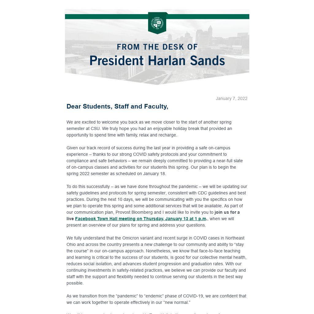 We fully understand that the Omicron variant and recent surge in COVID cases in Northeast Ohio and across the country presents a new challenge to our community and ability to “stay the course” in our on-campus approach. Nonetheless, we know that face-to-face teaching and learning is critical to the success of our students, is good for our collective mental health, reduces social isolation, and advances student progression and graduation rates. With our continuing investments in safety-related practices, we believe we can provide our faculty and staff with the support and flexibility needed to continue serving our students in the best way possible.