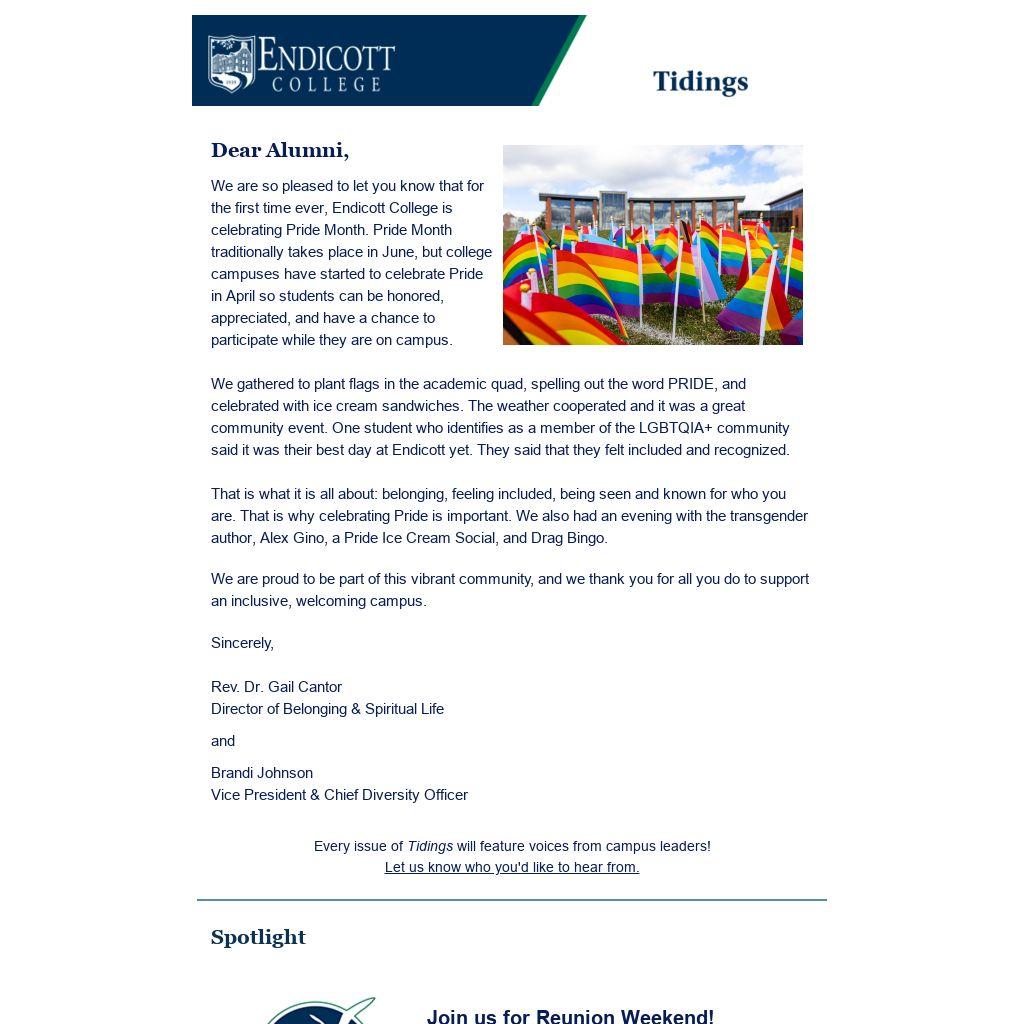 We gathered to plant flags in the academic quad, spelling out the word PRIDE, and celebrated with ice cream sandwiches. The weather cooperated and it was a great community event. One student who identifies as a member of the LGBTQIA+ community said it was their best day at Endicott yet. They said that they felt included and recognized.