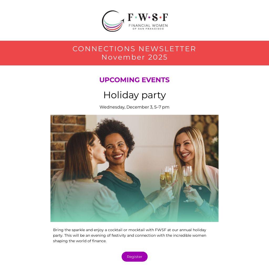 Bring the sparkle and enjoy a cocktail or mocktail with FWSF at our annual holiday party. This will be an evening of festivity and connection with the incredible women shaping the world of finance.