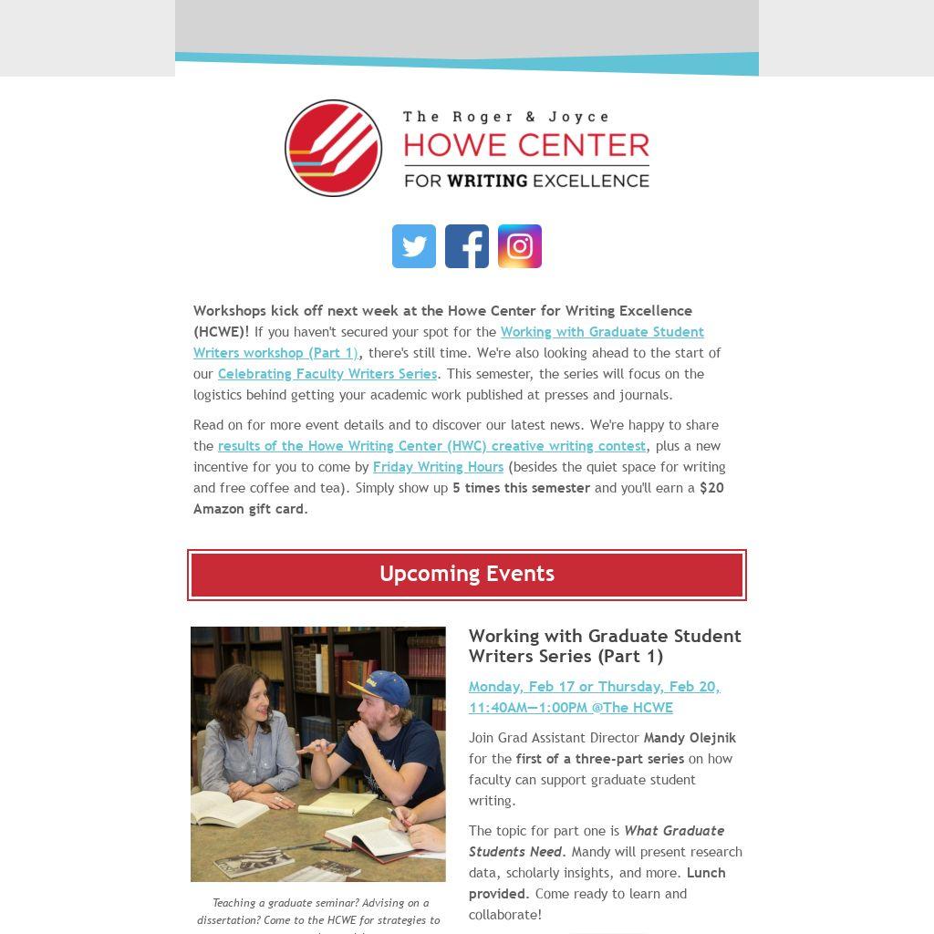 Workshops kick off next week at the Howe Center for Writing Excellence (HCWE)! If you haven't secured your spot for the Working with Graduate Student Writers workshop (Part 1)there's still time. We're also looking ahead to the start of our Celebrating Faculty Writers Series. This semester, the series will focus on the logistics behind getting your academic work published at presses and journals.