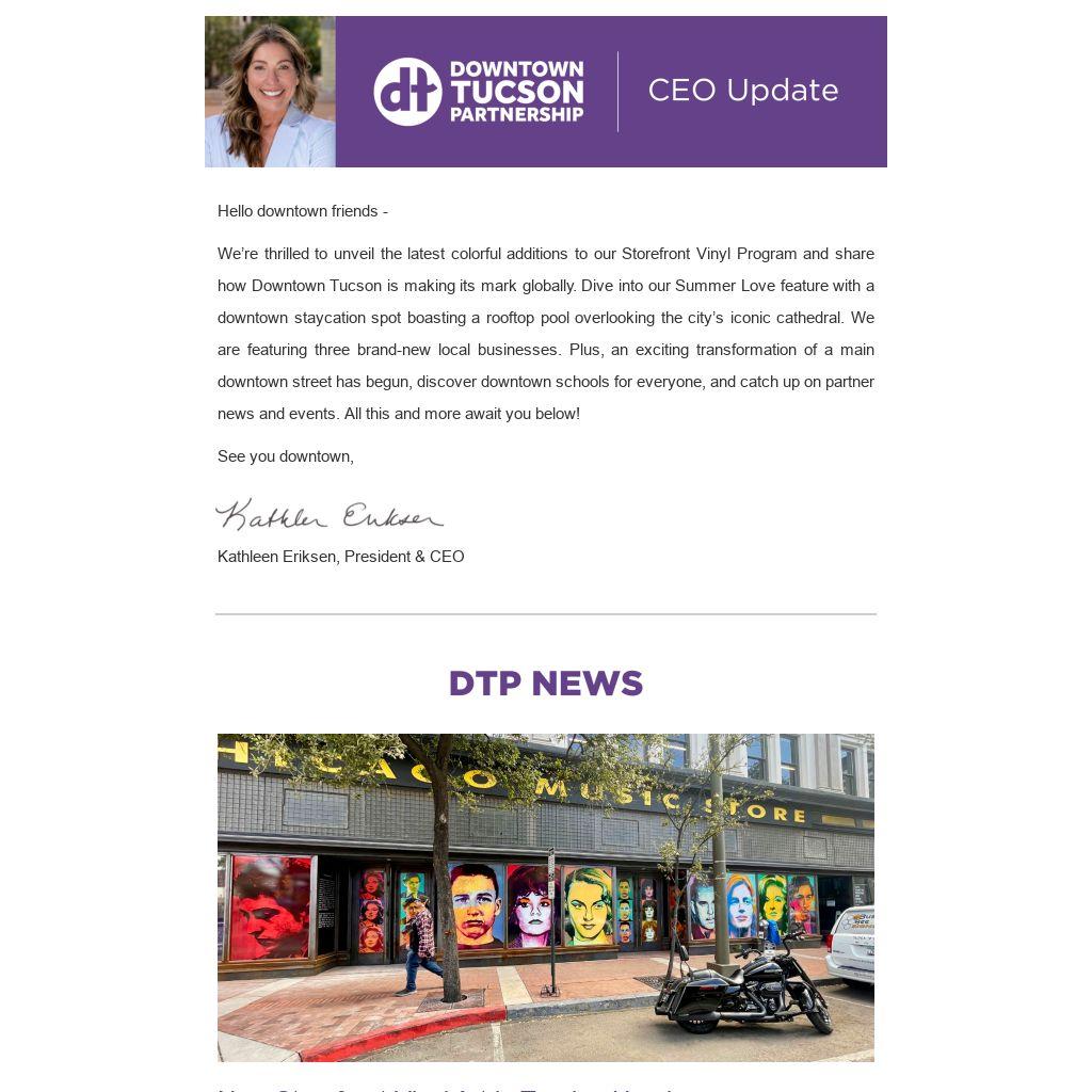 We’re thrilled to unveil the latest colorful additions to our Storefront Vinyl Program and share how Downtown Tucson is making its mark globally. Dive into our Summer Love feature with a downtown staycation spot boasting a rooftop pool overlooking the city’s iconic cathedral. We are featuring three brand-new local businesses. Plus, an exciting transformation of a main downtown street has begun, discover downtown schools for everyone, and catch up on partner news and events. All this and more await you below!