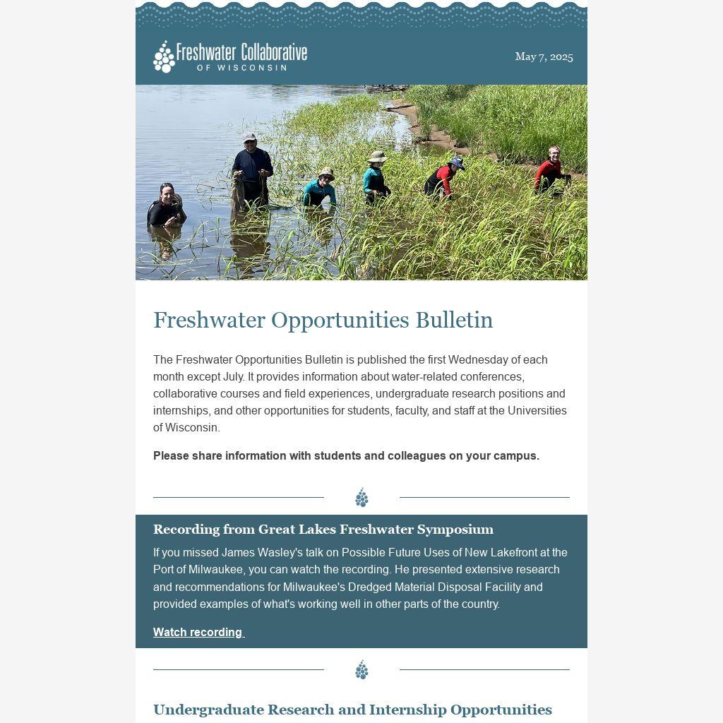 The Freshwater Opportunities Bulletin is published the first Wednesday of each month except July. It provides information about water-related conferences, collaborative courses and field experiences, undergraduate research positions and internships, and other opportunities for students, faculty, and staff at the Universities of Wisconsin.