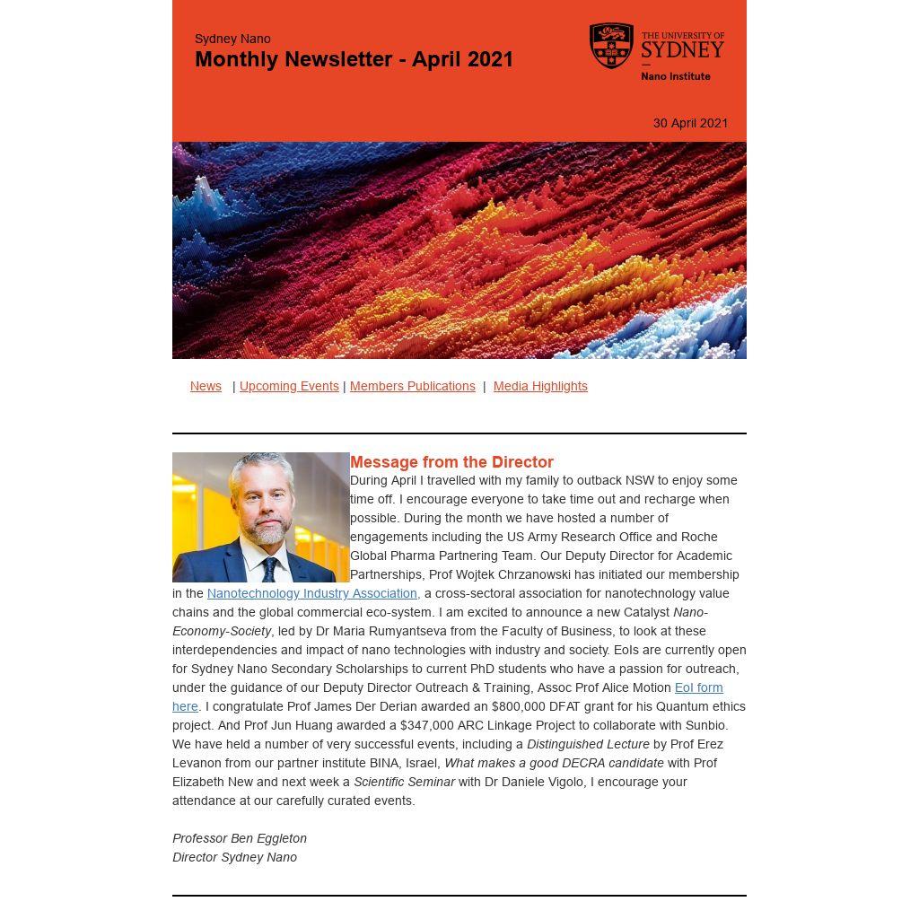 Message from the DirectorDuring April I travelled with my family to outback NSW to enjoy some time off. I encourage everyone to take time out and recharge when possible. During the month we have hosted a number of engagements including the US Army Research Office and Roche Global Pharma Partnering Team. Our Deputy Director for Academic Partnerships, Prof Wojtek Chrzanowski has initiated our membership in the Nanotechnology Industry Association, a cross-sectoral association for nanotechnology value chains and the global commercial eco-system. I am excited to announce a new Catalyst Nano-Economy-Society, led by Dr Maria Rumyantseva from the Faculty of Business, to look at these interdependencies and impact of nano technologies with industry and society. EoIs are currently open for Sydney Nano Secondary Scholarships to current PhD students who have a passion for outreach, under the guidance of our Deputy Director Outreach & Training, Assoc Prof Alice Motion EoI form here. I congratulate Prof James Der Derian awarded an $800,000 DFAT grant for his Quantum ethics project. And Prof Jun Huang awarded a $347,000 ARC Linkage Project to collaborate with Sunbio. We have held a number of very successful events, including a Distinguished Lecture by Prof Erez Levanon from our partner institute BINA, Israel, What makes a good DECRA candidate with Prof Elizabeth New and next week a Scientific Seminar with Dr Daniele Vigolo, I encourage your attendance at our carefully curated events.