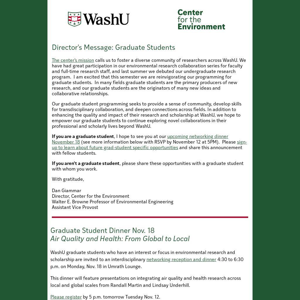 The center's mission calls us to foster a diverse community of researchers across WashU. We have had great participation in our environmental research collaboration series for faculty and full-time research staff, and last summer we debuted our undergraduate research program. I am excited that this semester we are reinvigorating our programming for graduate students. In many fields graduate students are the primary producers of new research, and our graduate students are the originators of many new ideas and collaborative relationships.