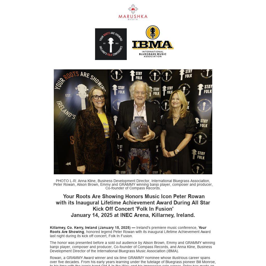 Killarney, Co. Kerry, Ireland (January 15, 2025) — Ireland's premiere music conference, Your Roots Are Showing, honored legend Peter Rowan with its inaugural Lifetime Achievement Award last night during its kick off concert, Folk In Fusion.