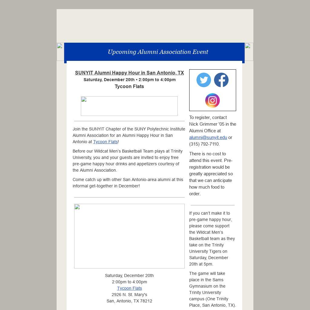 If you can’t make it to pre-game happy hour, please come support the Wildcat Men’s Basketball team as they take on the Trinity University Tigers on Saturday, December 20th at 5pm.