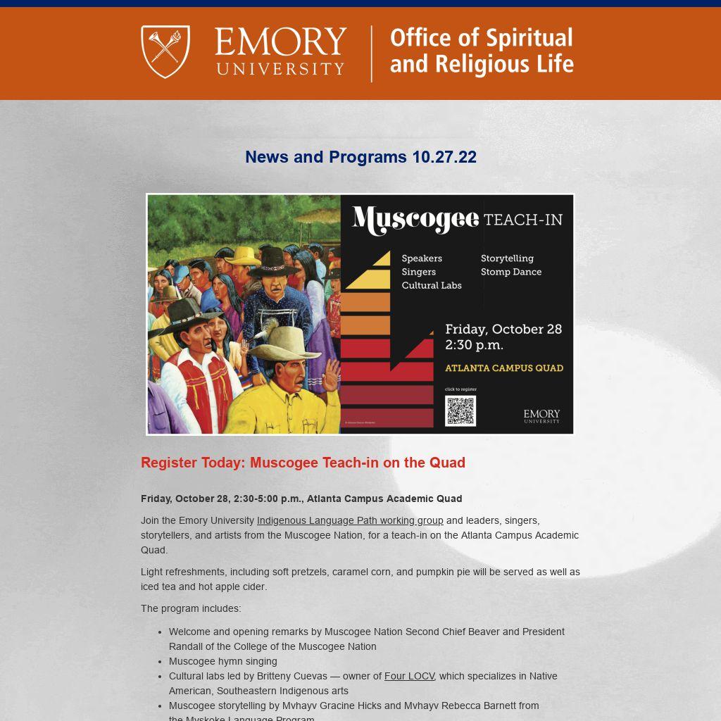 Emory OSRL ENews is published weekly during the term by the Emory University Office of Spiritual and Religious Life publicizing Atlanta-campus spiritual life programs. It is not a comprehensive listing. For Oxford College spiritual life, please click here. To submit information or to update your preferences, please contact religiouslife@emory.edu.