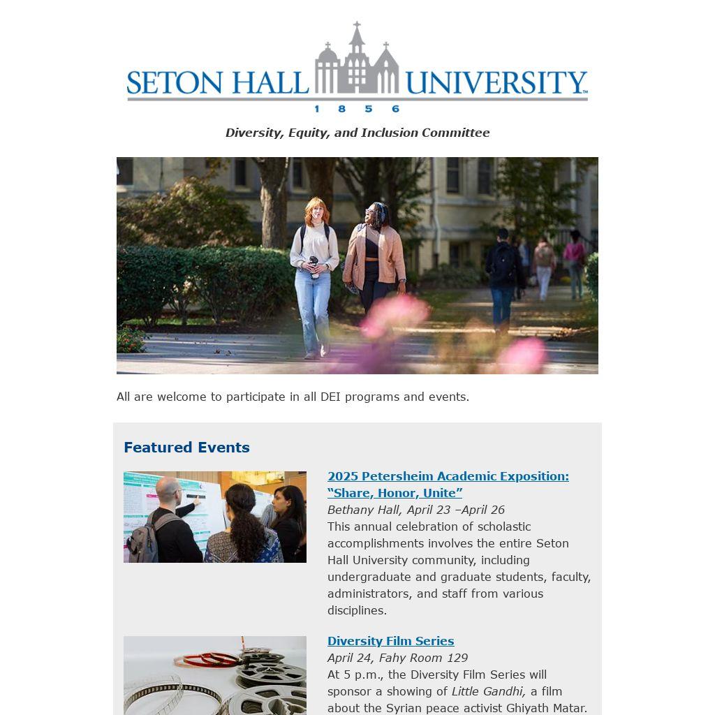 The Diversity, Equity and Inclusion Committee encourages you to participate in the 2025 Survey, an important way we can take a collective pulse on our community's views on inclusivity and help in our efforts to measure and report on climate at the University. Please search your email for “2025 Survey” with a unique link and contact dei@shu.edu with any questions or concerns. The survey is voluntary, and the results are confidential. The survey is conducted every other year and provides insight to help us plan for future programming, workshops, and events to enhance inclusion efforts on campus.