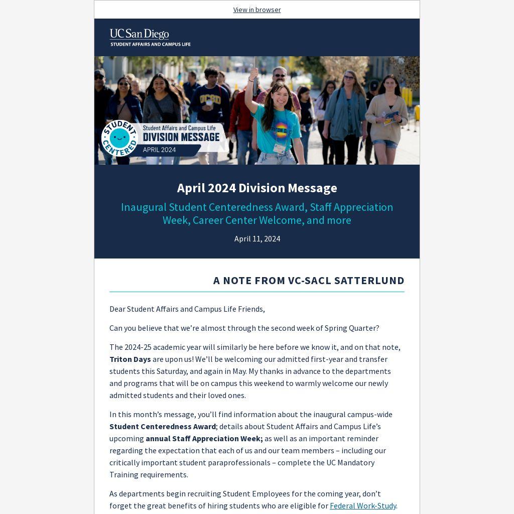 Below, please continue reading to join me in: welcoming the Career Center to the Division of Student Affairs and Campus Life; perusing a slideshow of Tritons enjoying Spring Break 2024 activities; learning how to provide important feedback that may contribute to more paid research opportunities for undergraduate students; and more.