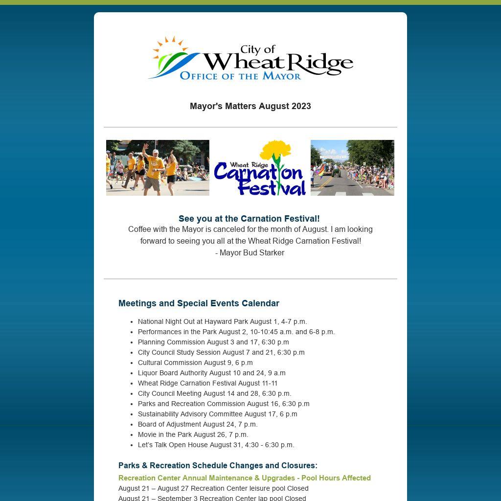 See you at the Carnation Festival! Coffee with the Mayor is canceled for the month of August. I am looking forward to seeing you all at the Wheat Ridge Carnation Festival! - Mayor Bud Starker