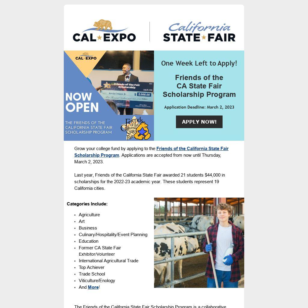 Grow your college fund by applying to the Friends of the California State Fair Scholarship Program. Applications are accepted from now until Thursday, March 2, 2023.
