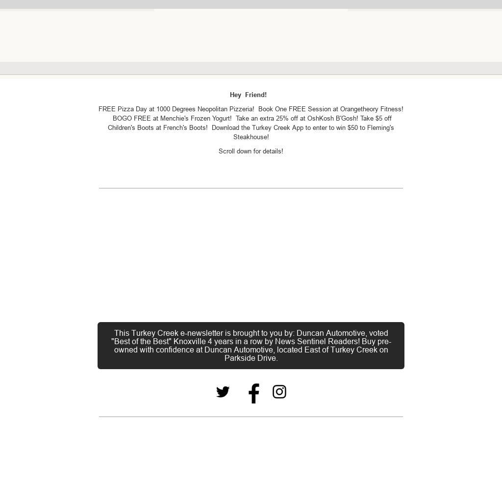 FREE Pizza Day at 1000 Degrees Neopolitan Pizzeria! Book One FREE Session at Orangetheory Fitness! BOGO FREE at Menchie's Frozen Yogurt! Take an extra 25% off at OshKosh B'Gosh! Take $5 off Children's Boots at French's Boots! Download the Turkey Creek App to enter to win $50 to Fleming's Steakhouse!