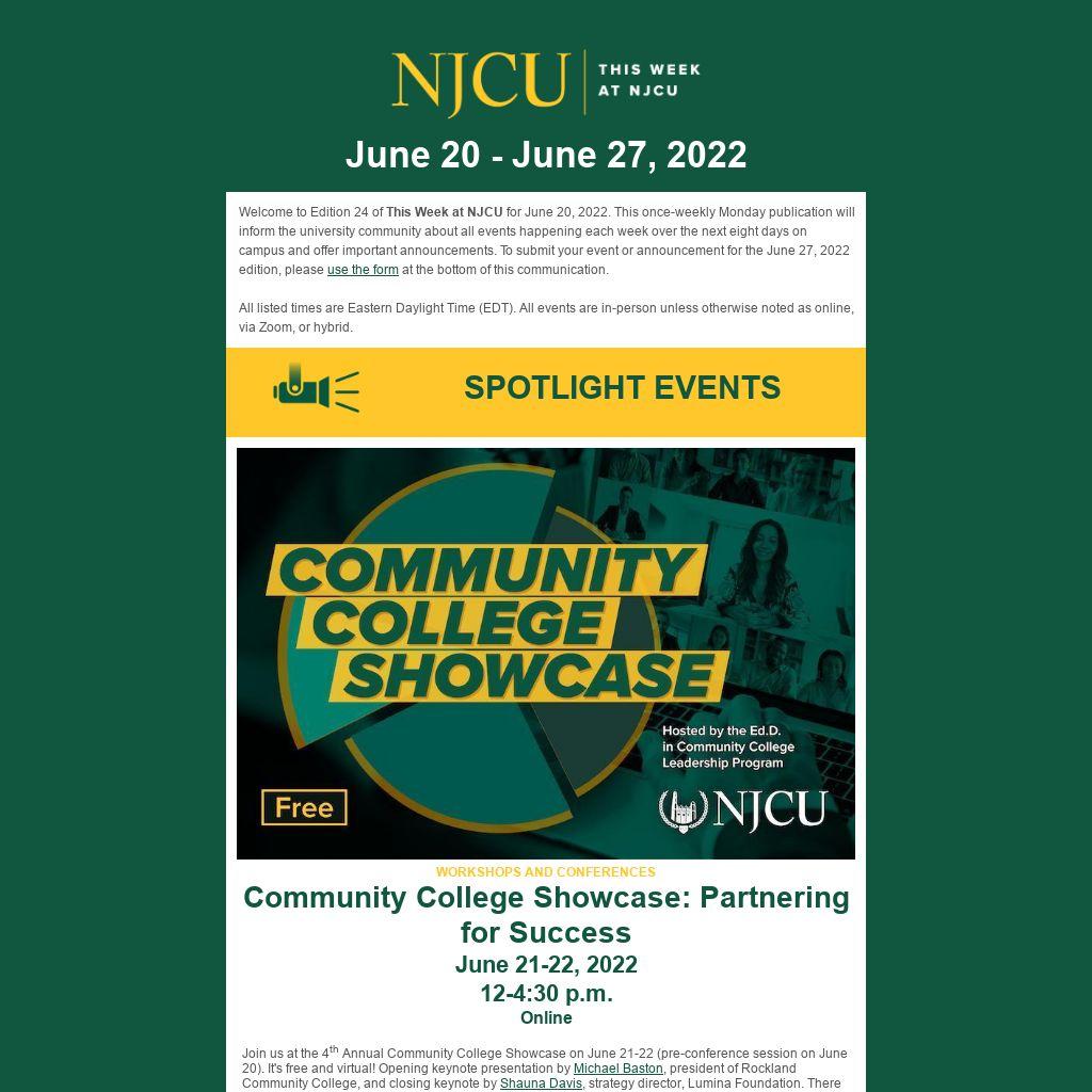 Welcome to Edition 24 of This Week at NJCU for June 20, 2022. This once-weekly Monday publication will inform the university community about all events happening each week over the next eight days on campus and offer important announcements. To submit your event or announcement for the June 27, 2022 edition, please use the form at the bottom of this communication.