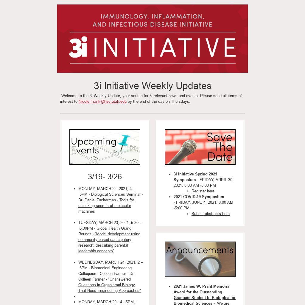 Welcome to the 3i Weekly Update, your source for 3i relevant news and events. Please send all items of interest to Nicole.Frank@hsc.utah.edu by the end of the day on Thursdays.