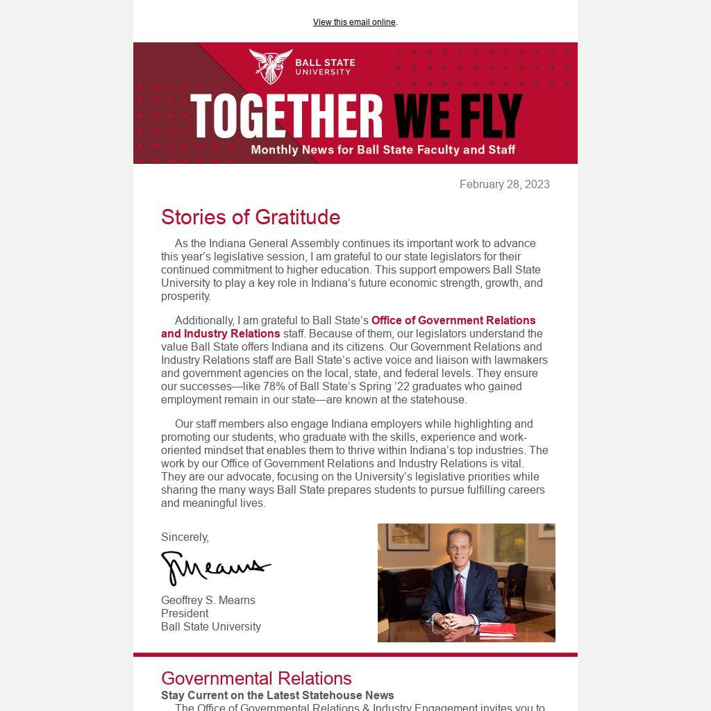 As the Indiana General Assembly continues its important work to advance this year’s legislative session, I am grateful to our state legislators for their continued commitment to higher education. This support empowers Ball State University to play a key role in Indiana’s future economic strength, growth, and prosperity.