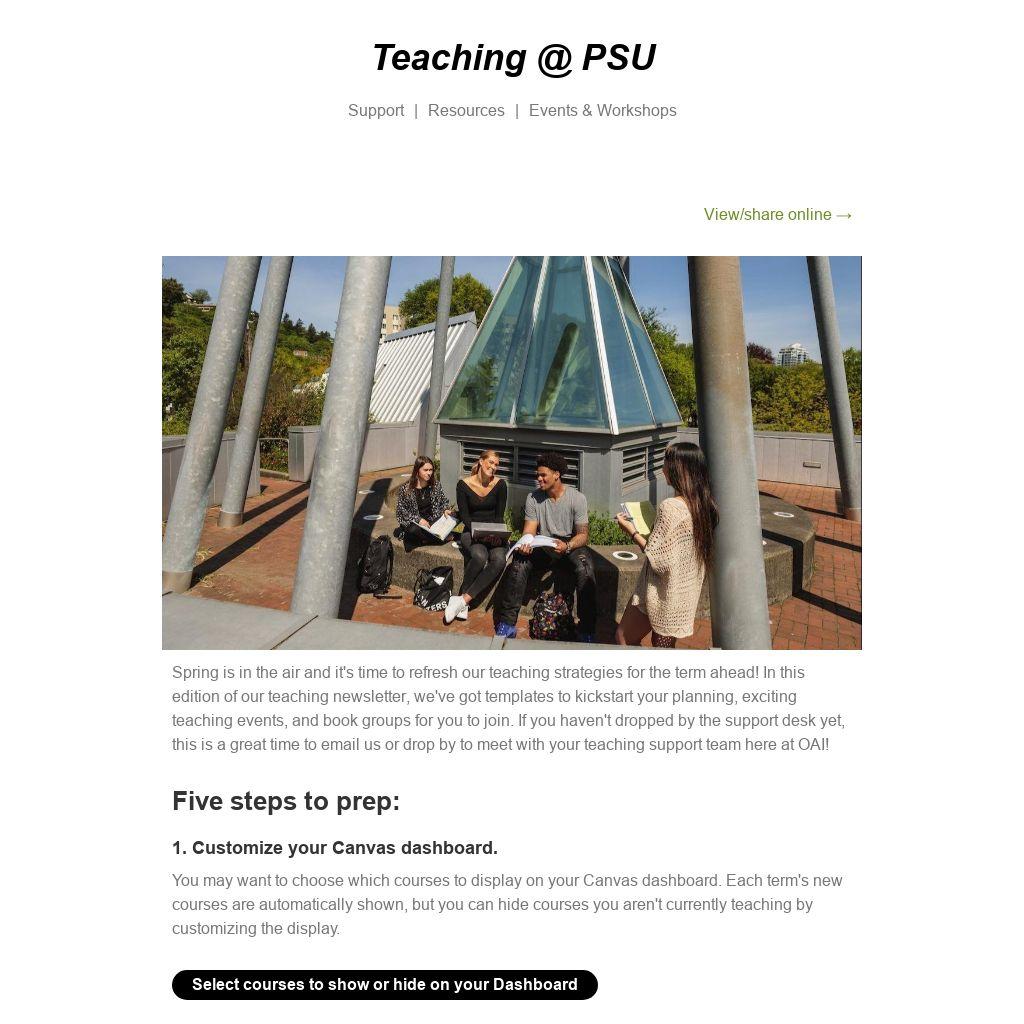Spring is in the air and it's time to refresh our teaching strategies for the term ahead! In this edition of our teaching newsletter, we've got templates to kickstart your planning, exciting teaching events, and book groups for you to join. If you haven't dropped by the support desk yet, this is a great time to email us or drop by to meet with your teaching support team here at OAI!