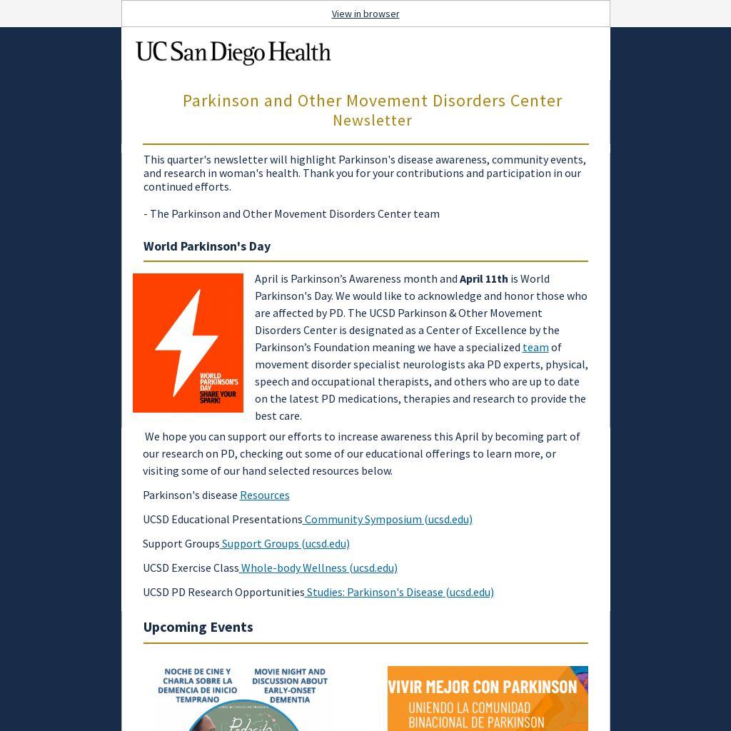 April is Parkinson’s Awareness month and April 11th is World Parkinson's Day. We would like to acknowledge and honor those who are affected by PD. The UCSD Parkinson & Other Movement Disorders Center is designated as a Center of Excellence by the Parkinson’s Foundation meaning we have a specialized team of movement disorder specialist neurologists aka PD experts, physical, speech and occupational therapists, and others who are up to date on the latest PD medications, therapies and research to provide the best care.