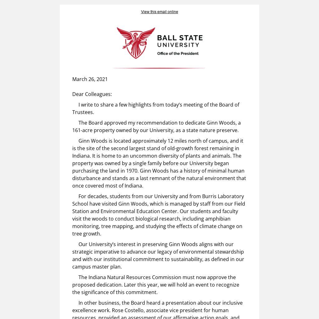 The Board approved my recommendation to dedicate Ginn Woods, a 161-acre property owned by our University, as a state nature preserve.