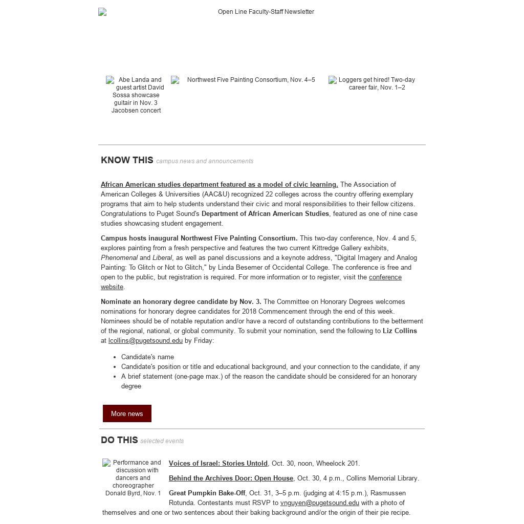 African American studies department featured as a model of civic learning. The Association of American Colleges & Universities (AAC&U) recognized 22 colleges across the country offering exemplary programs that aim to help students understand their civic and moral responsibilities to their fellow citizens. Congratulations to Puget Sound's Department of African American Studies, featured as one of nine case studies showcasing student engagement. Campus hosts inaugural Northwest Five Painting Consortium. This two-day conference, Nov. 4 and 5, explores painting from a fresh perspective and features the two current Kittredge Gallery exhibits, Phenomenal and Liberal, as well as panel discussions and a keynote address, "Digital Imagery and Analog Painting: To Glitch or Not to Glitch," by Linda Besemer of Occidental College. The conference is free and open to the public, but registration is required. For more information or to register, visit the conference website. Nominate an honorary degree candidate by Nov. 3. The Committee on Honorary Degrees welcomes nominations for honorary degree candidates for 2018 Commencement through the end of this week. Nominees should be of notable reputation and/or have a record of outstanding contributions to the betterment of the regional, national, or global community. To submit your nomination, send the following to Liz Collins at lcollins@pugetsound.edu by Friday: - Candidate's name