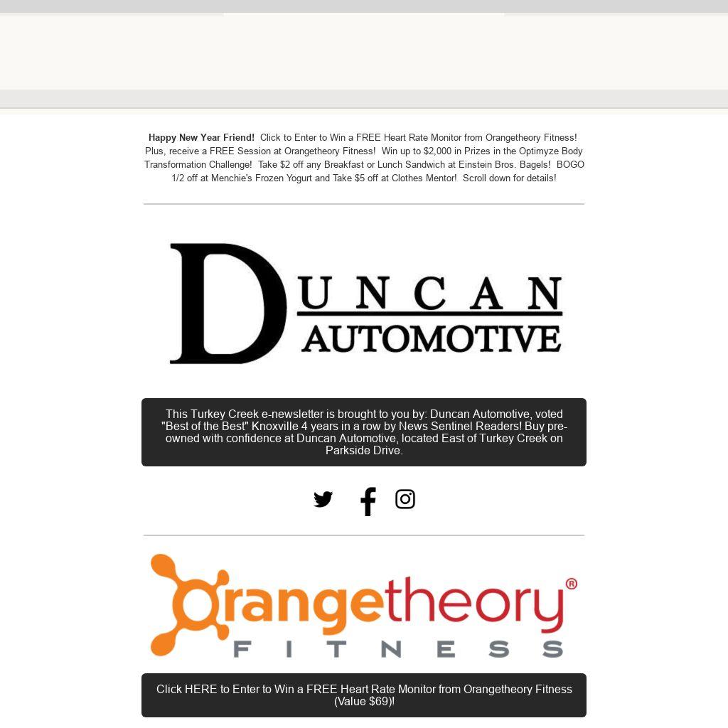 Happy New Year Friend! Click to Enter to Win a FREE Heart Rate Monitor from Orangetheory Fitness! Plus, receive a FREE Session at Orangetheory Fitness! Win up to $2,000 in Prizes in the Optimyze Body Transformation Challenge! Take $2 off any Breakfast or Lunch Sandwich at Einstein Bros. Bagels! BOGO 1/2 off at Menchie's Frozen Yogurt and Take $5 off at Clothes Mentor! Scroll down for details!