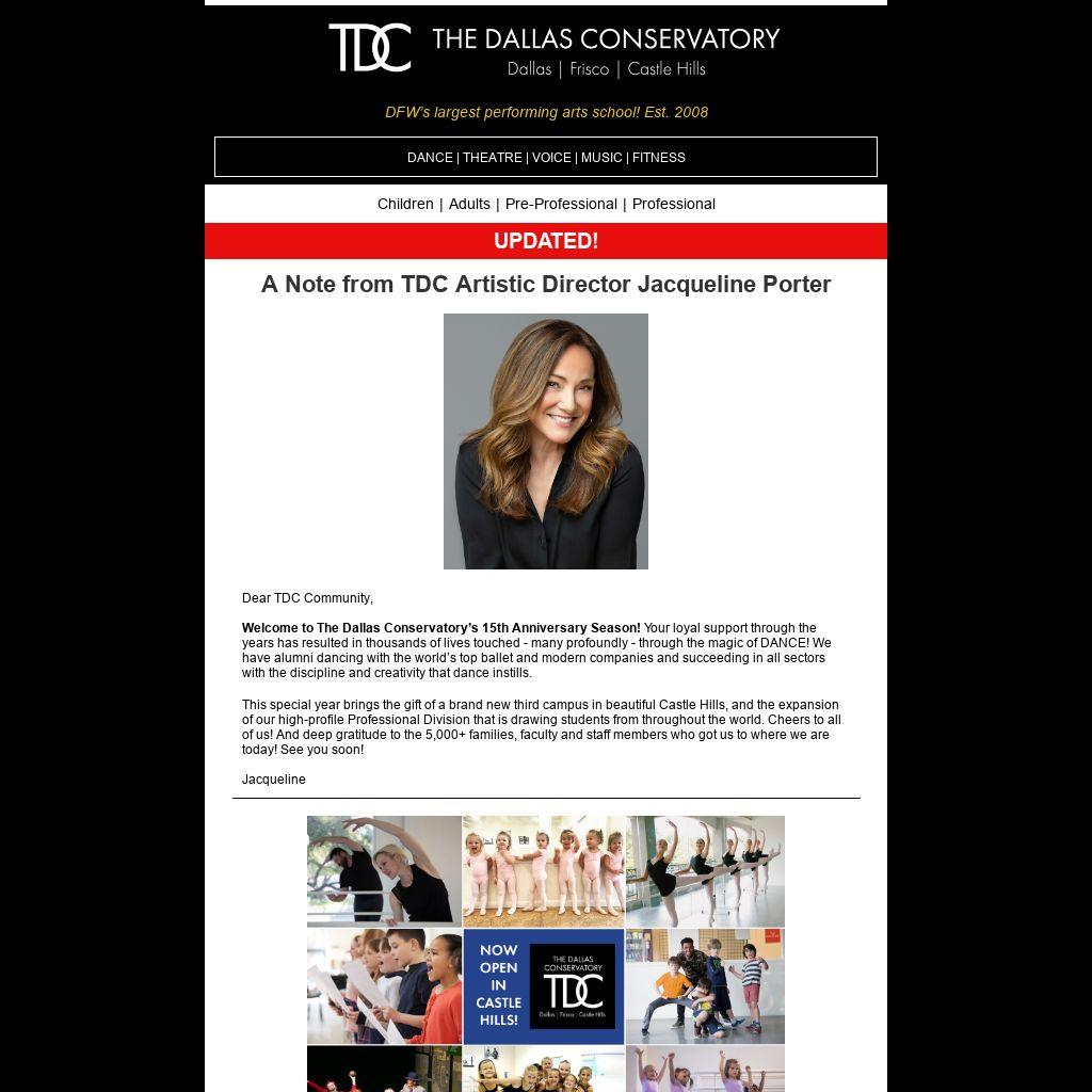 Dear TDC Community, Welcome to The Dallas Conservatory’s 15th Anniversary Season! Your loyal support through the years has resulted in thousands of lives touched - many profoundly - through the magic of DANCE! We have alumni dancing with the world’s top ballet and modern companies and succeeding in all sectors with the discipline and creativity that dance instills.