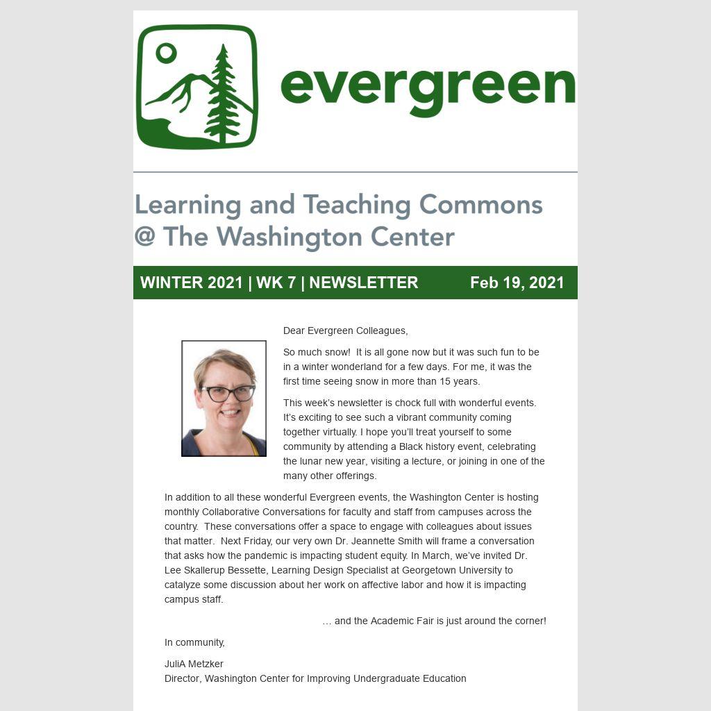 In addition to all these wonderful Evergreen events, the Washington Center is hosting monthly Collaborative Conversations for faculty and staff from campuses across the country. These conversations offer a space to engage with colleagues about issues that matter. Next Friday, our very own Dr. Jeannette Smith will frame a conversation that asks how the pandemic is impacting student equity. In March, we’ve invited Dr. Lee Skallerup Bessette, Learning Design Specialist at Georgetown University to catalyze some discussion about her work on affective labor and how it is impacting campus staff.