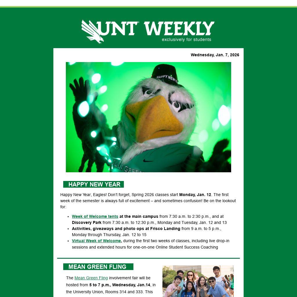 Happy New Year, Eagles! Don’t forget, Spring 2026 classes start Monday, Jan. 12. The first week of the semester is always full of excitement – and sometimes confusion! Be on the lookout for: