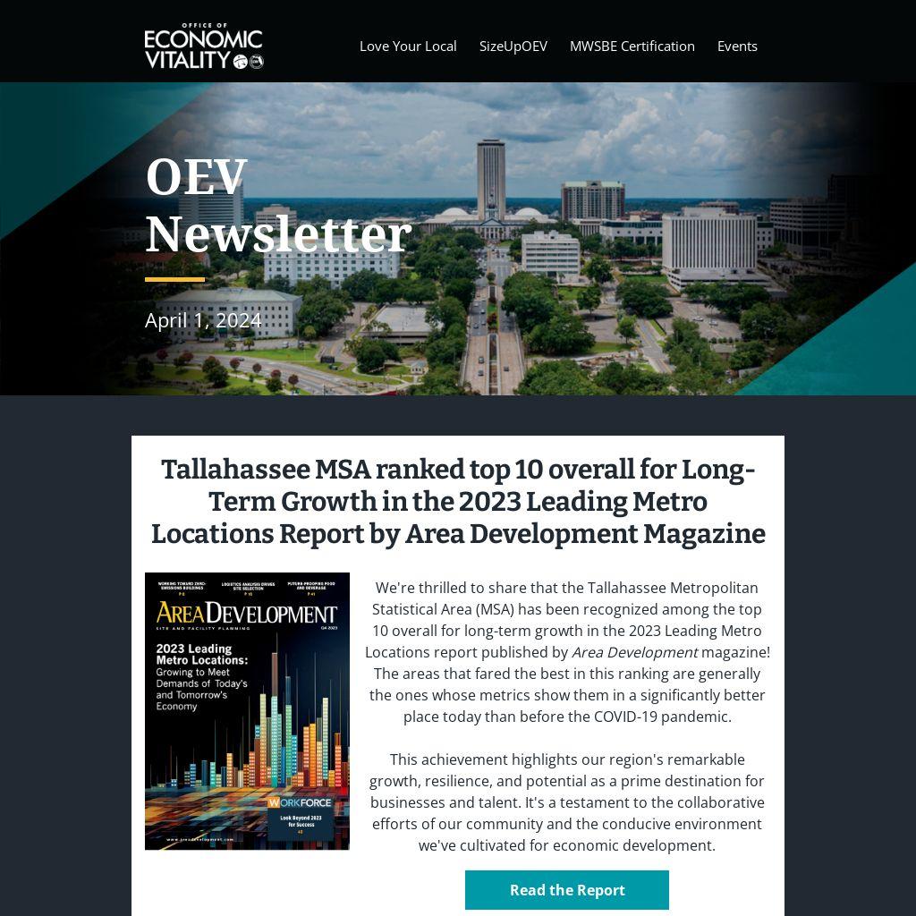 Delve into past issues of the OEV Newsletter to catch up on updates, insights, economic development initiatives, programs, and opportunities in Tallahassee-Leon County!