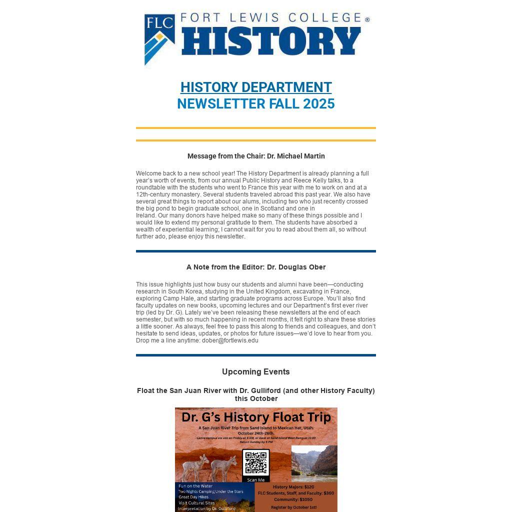 This issue highlights just how busy our students and alumni have been—conducting research in South Korea, studying in the United Kingdom, excavating in France, exploring Camp Hale, and starting graduate programs across Europe. You’ll also find faculty updates on new books, upcoming lectures and our Department’s first ever river trip (led by Dr. G). Lately we’ve been releasing these newsletters at the end of each semester, but with so much happening in recent months, it felt right to share these stories a little sooner. As always, feel free to pass this along to friends and colleagues, and don’t hesitate to send ideas, updates, or photos for future issues—we’d love to hear from you. Drop me a line anytime: dober@fortlewis.edu