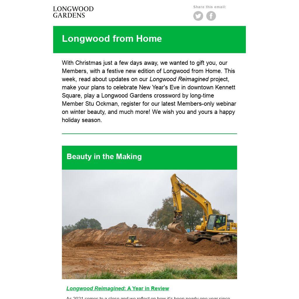 With Christmas just a few days away, we wanted to gift you, our Members, with a festive new edition of Longwood from Home. This week, read about updates on our Longwood Reimagined project, make your plans to celebrate New Year's Eve in downtown Kennett Square, play a Longwood Gardens crossword by long-time Member Stu Ockman, register for our latest Members-only webinar on winter beauty, and much more! We wish you and yours a happy holiday season.