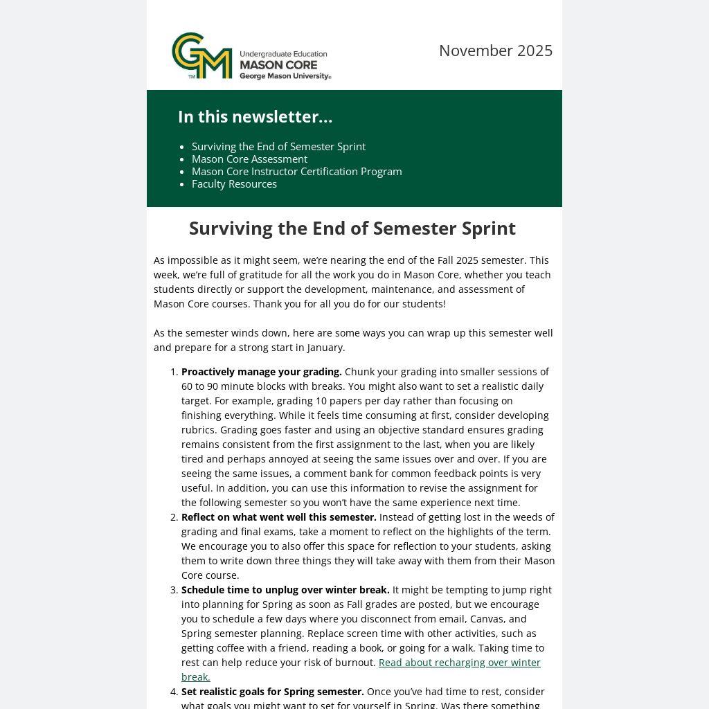 - Reflect on what went well this semester. Instead of getting lost in the weeds of grading and final exams, take a moment to reflect on the highlights of the term. We encourage you to also offer this space for reflection to your students, asking them to write down three things they will take away with them from their Mason Core course.