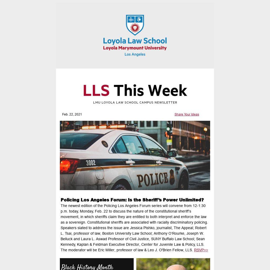 Policing Los Angeles Forum: Is the Sheriff’s Power Unlimited? The newest edition of the Policing Los Angeles Forum series will convene from 12-1:30 p.m. today, Monday, Feb. 22 to discuss the nature of the constitutional sheriff’s movement, in which sheriffs claim they are entitled to both interpret and enforce the law as a sovereign. Constitutional sheriffs are associated with racially discriminatory policing. Speakers slated to address the issue are Jessica Pishko, journalist, The Appeal; Robert L. Tsai, professor of law, Boston University Law School; Anthony O’Rourke, Joseph W. Belluck and Laura L. Aswad Professor of Civil Justice, SUNY Buffalo Law School; Sean Kennedy, Kaplan & Feldman Executive Director, Center for Juvenile Law & Policy, LLS. The moderator will be Eric Miller, professor of law & Leo J. O'Brien Fellow, LLS. RSVP>>