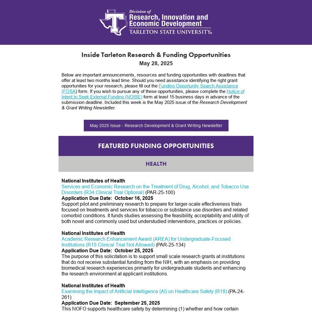 Below are important announcements, resources and funding opportunities with deadlines that offer at least two months lead time. Should you need assistance identifying the right grant opportunities for your research, please fill out the Funding Opportunity Search Assistance (FOSA) form. If you wish to pursue any of these opportunities, please complete the Notice of Intent to Seek External Funding (NOISE) form at least 15 business days in advance of the submission deadline. Included this week is the May 2025 issue of the Research Development & Grant Writing Newsletter.