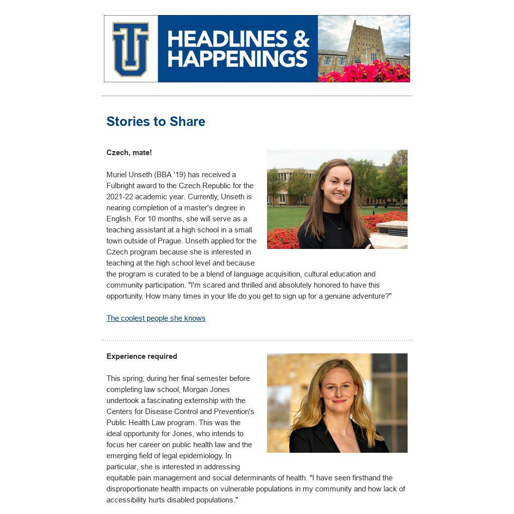 Muriel Unseth (BBA '19) has received a Fulbright award to the Czech Republic for the 2021-22 academic year. Currently, Unseth is nearing completion of a master's degree in English. For 10 months, she will serve as a teaching assistant at a high school in a small town outside of Prague. Unseth applied for the Czech program because she is interested in teaching at the high school level and because the program is curated to be a blend of language acquisition, cultural education and community participation. "I'm scared and thrilled and absolutely honored to have this opportunity. How many times in your life do you get to sign up for a genuine adventure?"