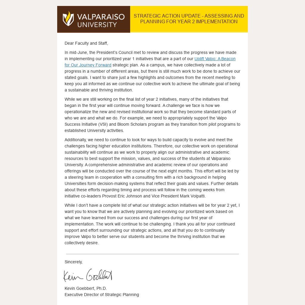 While I don’t have a complete list of what our strategic action initiatives will be for year 2 yet, I want you to know that we are actively planning and evolving our prioritized work based on what we have learned from our success and challenges during our first year of implementation. The work will continue to be challenging. I thank you all for your continued support and effort surrounding our strategic actions, and all that you do to continually improve Valpo to better serve our students and become the thriving institution that we collectively desire.
