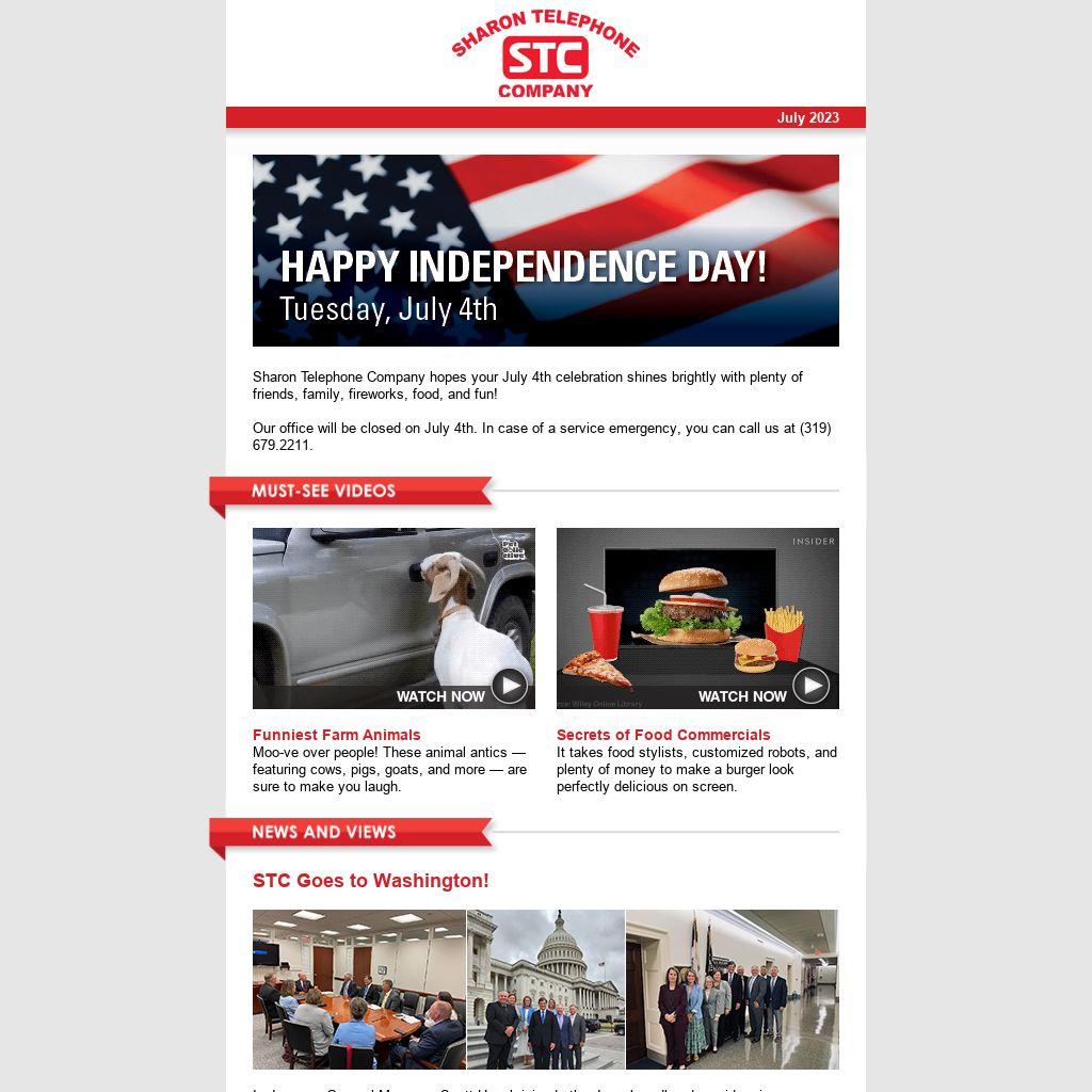 Sharon Telephone Company hopes your July 4th celebration shines brightly with plenty of friends, family, fireworks, food, and fun! Our office will be closed on July 4th. In case of a service emergency, you can call us at (319) 679.2211. |