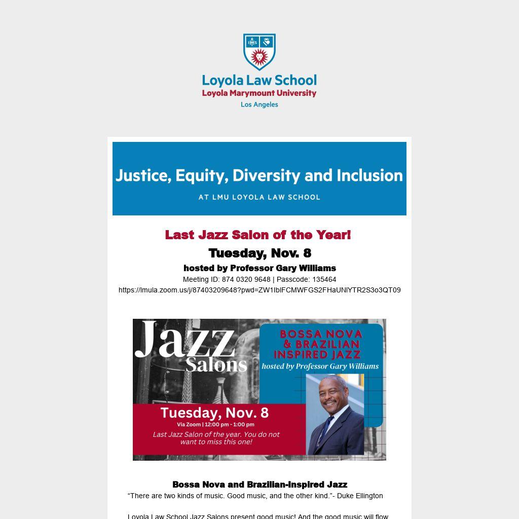 Loyola Law School Jazz Salons present good music! And the good music will flow next Tuesday, November 8 during the final Jazz Salon of the fall 2022 semester
